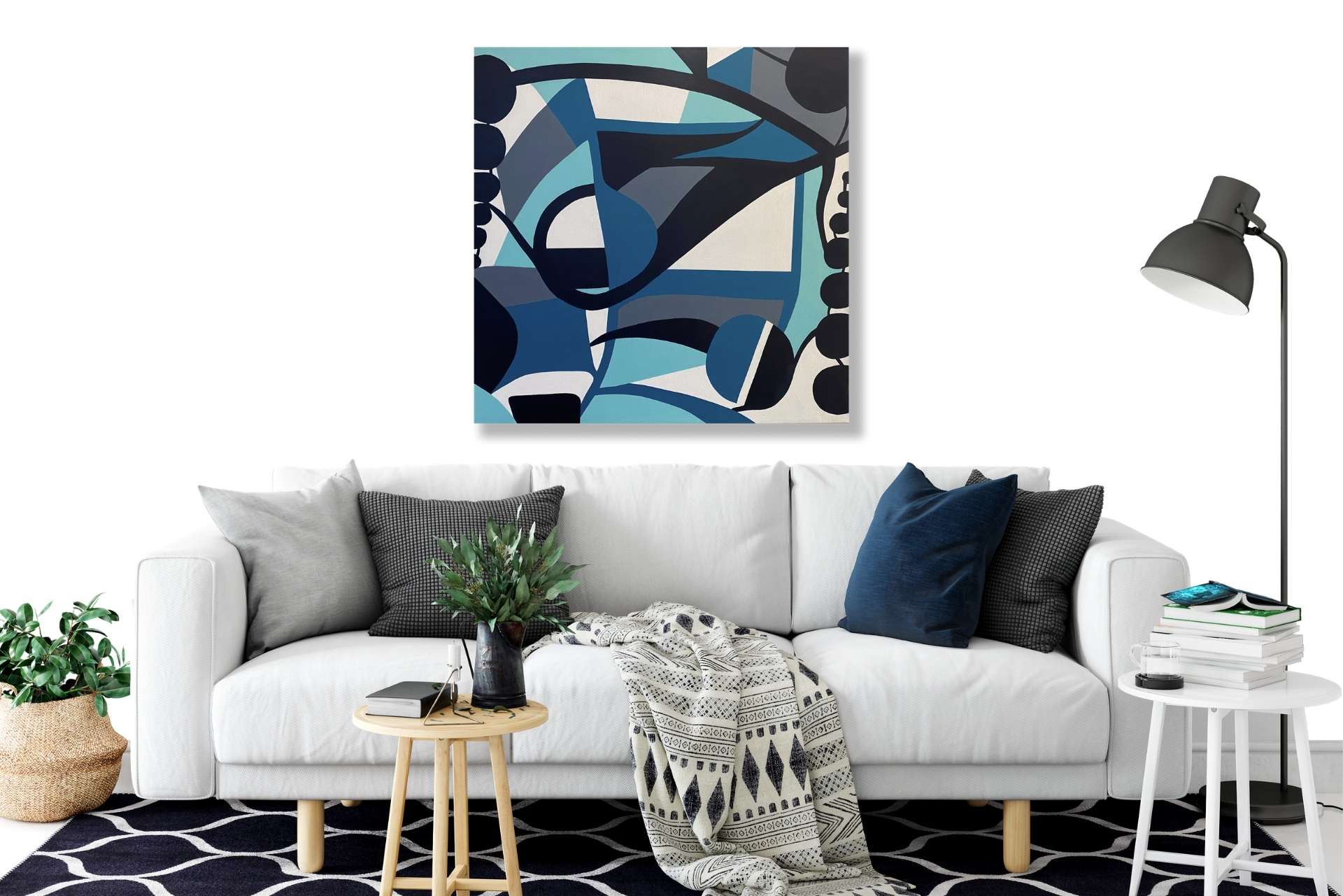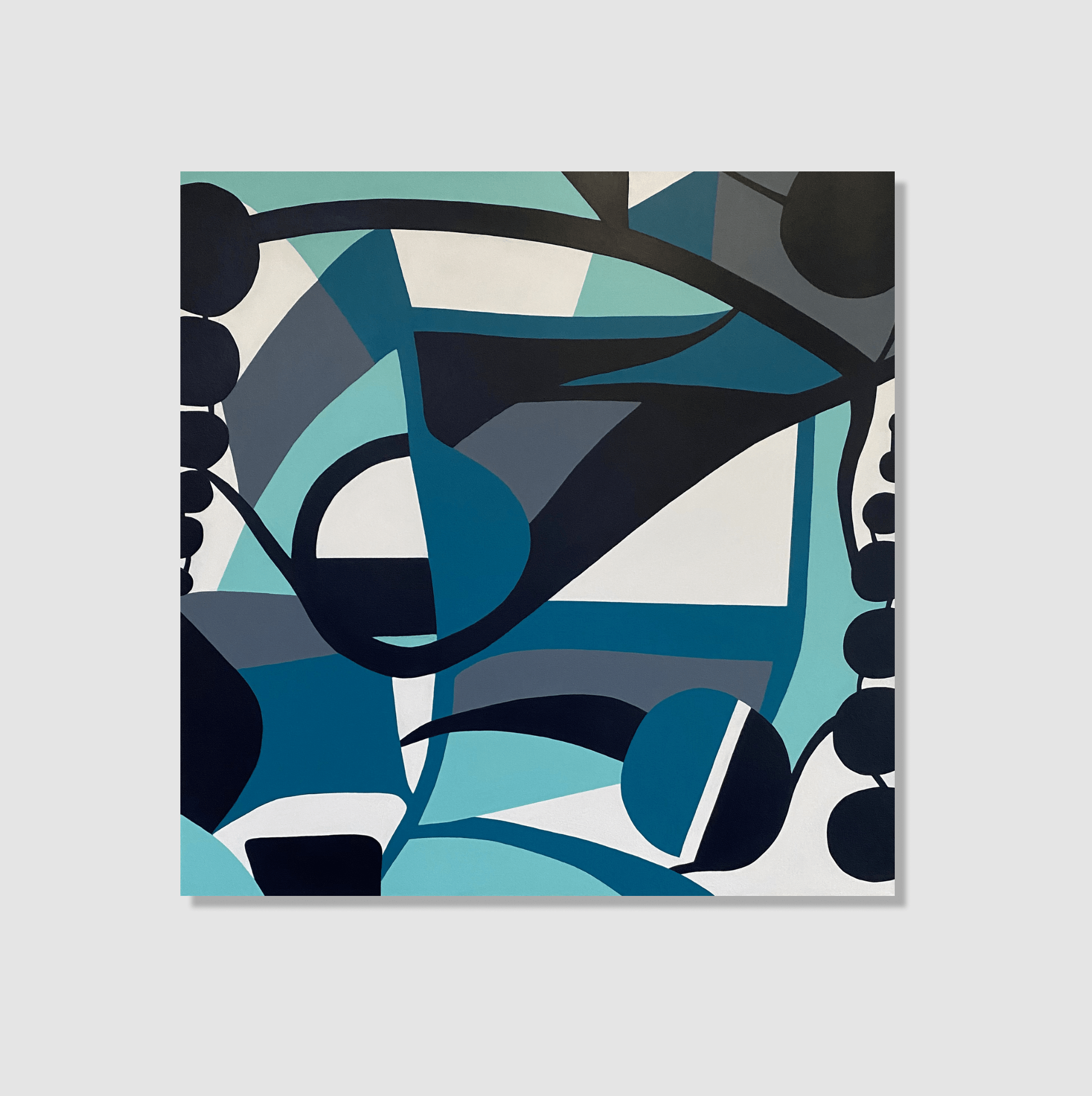 This painting actually began as a bunch of charcoal lines on the canvas. As I worked on it, I began to see the shapes form. Once I did, the colours began and here we are. The straight lines are hand painted. It took me hours to get those neat edges.