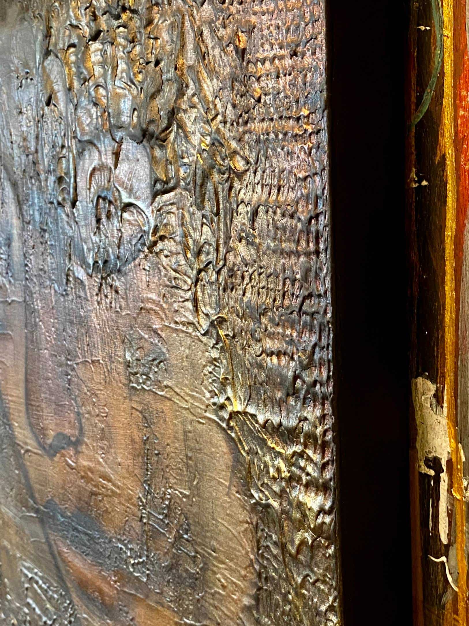 The reflective mood of this woman against the textured backdrop reminds me of the moments when I try to find peace during the challenges of life. The bronze and gold colours give it a Balinese feel and the high gloss finish enhances the texture. Large painting. Ready to hang.